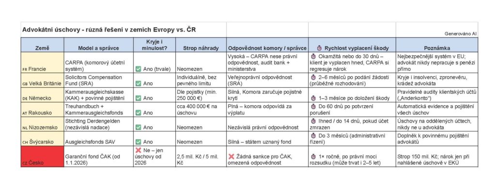 Rozdíly jsou ale zásadní: český model (ČAK 2025) skýtá významná rizika pro případné poškozené klienty advokátních úschov. To občané západoevropských zemí mají u fondů své složené finance ochráněné výrazně spolehlivěji.